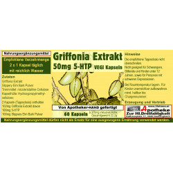 2 Kapseln (Tagesdosis) enthalten 102mg Griffonia Extrakt davon 100mg 5-HTP, 100mg Slippery Elm Bark Pulver.